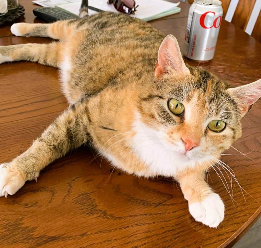 She loves to sit on your lap and get her neck scratched. She will purr up a storm for pets. She loves people but doesn’t care for other cats or small dogs at this time. It may be because she’s defending her babies, or possibly because of other cats in the barn harassing her.