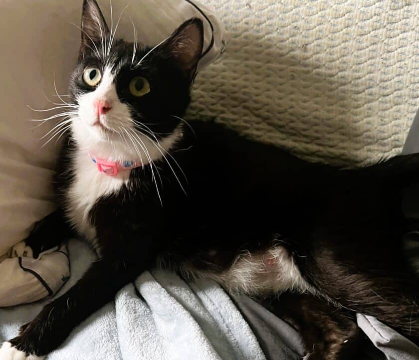 She is shy and scared at first, but when you show her it’s safe, she is a lover. She is tolerant of other cats, and with proper introduction she maybe OK with a friend.
