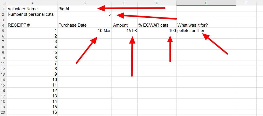 • If you have multiple cats in the house, some of which are your own, and you’ve purchased shared items for all of them (like litter, certain food, toys, etc.), please indicate the percentage of each purchase spent for ECWAR cats. If a purchase receipt is all for ECWAR cats, the percentage would be 100.